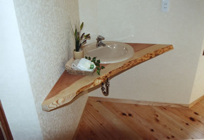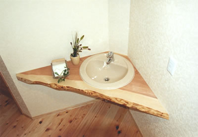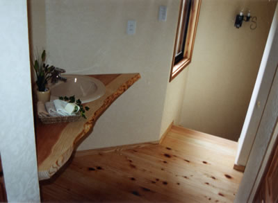 ちょっとした無垢材使いで味気ない洗面台も癒される空間に。